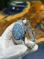 Mặt số màu đen nhám, chi tiết bạc và xanh dương nổi bật, tạo cảm giác mạnh mẽ và thể thao.