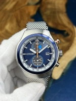 Citizen CA7011‑83L là đồng hồ chronograph Eco‑Drive calibre B642 (tích hợp sạc ánh sáng, dự trữ ~7 tháng). Mặt số xanh navy với hai mặt phụ, vạch và kim phủ dạ quang, cùng viền tachymeter. Vỏ 43,5 mm – dày 11,8 mm – thép không gỉ, kính khoáng, dây lưới thép quai mesh. Chống nước 100 m, có lịch ngày. Phong cách vintage thể thao, linh hoạt từ bơi nhẹ đến dùng hàng ngày.