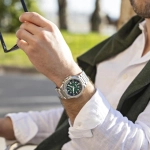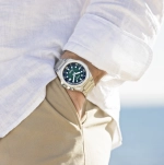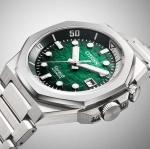 Mặt đồng hồ có tông màu xanh lá cây đậm gợi lên hình ảnh những hàng cây đung đưa trong gió biển, dựa trên họa tiết của một khu nghỉ dưỡng ven biển tươi tốt.