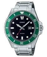 Điểm nhấn của Casio MDV-107D-3AVDF chính là mặt số đen, vành bezel xanh, nổi bật với bộ kim to bản và cọc số phủ dạ quang siêu sáng. Vòng bezel xoay đơn hướng giúp theo dõi thời gian lặn chính xác, đồng thời tạo nên vẻ ngoài cực kỳ nam tính.