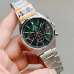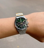 Mặt số xanh lục nổi bật với các mặt phụ sáng, mang phong cách chronograph “panda” cuốn hút.