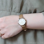 Mặt số màu be ánh hồng (rose beige) nhẹ nhàng, phối cùng kim và cọc số La Mã mạ vàng hồng tinh tế.