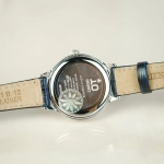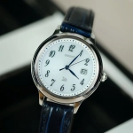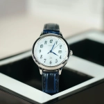 Mặt số trắng tinh khôi với kim xanh và cọc số Ả-rập nổi bật, dễ quan sát.