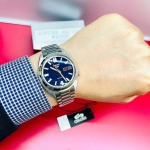 Mặt số xanh navy nổi bật, kim giây cam tạo điểm nhấn, cùng bộ cọc số phủ LumiBrite dễ quan sát trong bóng tối.