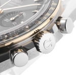 Đồng hồ có vỏ 42 mm bằng thép không gỉ với viền Vàng Moonshine™ 18K được đánh bóng. Vòng bezel được làm bằng gốm đen bóng [ZrO2] với thang đo tốc độ OMEGA Ceragold™. Có mặt số màu xám và đen đánh vecni với tất cả các cọc số và kim đều bằng Vàng Moonshine™ 18K - ngoại trừ kim giây đồng hồ bấm giờ trung tâm được phủ PVD bằng Vàng Moonshine. Vạch giờ độc đáo được đặt ở vị trí 11 giờ và có một mặt số phụ đặc biệt ở vị trí 9 giờ bằng Vàng Moonshine™ 18K với hình ảnh Buzz Aldrin được khắc laser đang trèo xuống bề mặt mặt trăng.