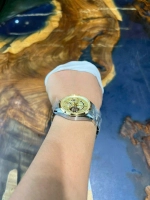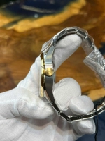 Các chi tiết vạch số và kim đồng hồ được mạ vàng nổi bật trên nền mặt số, vừa sang trọng vừa dễ đọc. Kim giờ phút kiểu dauphine vát cạnh sắc sảo cùng kim giây xanh lam nổi bật là điểm nhấn tinh tế của thiết kế.