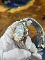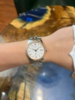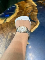 Điểm nổi bật đầu tiên là vỏ đồng hồ bằng thép không gỉ, phối hợp hài hòa với lớp mạ vàng hồng PVD ở viền bezel và dây demi, tạo nên vẻ ngoài sang trọng nhưng không quá phô trương. Mặt số màu bạc với họa tiết Guilloché cổ điển mang lại chiều sâu thẩm mỹ, đồng thời giúp tăng khả năng phản chiếu ánh sáng.
