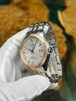 Điểm nổi bật đầu tiên là vỏ đồng hồ bằng thép không gỉ, phối hợp hài hòa với lớp mạ vàng hồng PVD ở viền bezel và dây demi, tạo nên vẻ ngoài sang trọng nhưng không quá phô trương. Mặt số màu bạc với họa tiết Guilloché cổ điển mang lại chiều sâu thẩm mỹ, đồng thời giúp tăng khả năng phản chiếu ánh sáng.