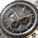 Đồng hồ có vỏ 42 mm bằng thép không gỉ với viền Vàng Moonshine™ 18K được đánh bóng. Vòng bezel được làm bằng gốm đen bóng [ZrO2] với thang đo tốc độ OMEGA Ceragold™. Có mặt số màu xám và đen đánh vecni với tất cả các cọc số và kim đều bằng Vàng Moonshine™ 18K - ngoại trừ kim giây đồng hồ bấm giờ trung tâm được phủ PVD bằng Vàng Moonshine. Vạch giờ độc đáo được đặt ở vị trí 11 giờ và có một mặt số phụ đặc biệt ở vị trí 9 giờ bằng Vàng Moonshine™ 18K với hình ảnh Buzz Aldrin được khắc laser đang trèo xuống bề mặt mặt trăng.